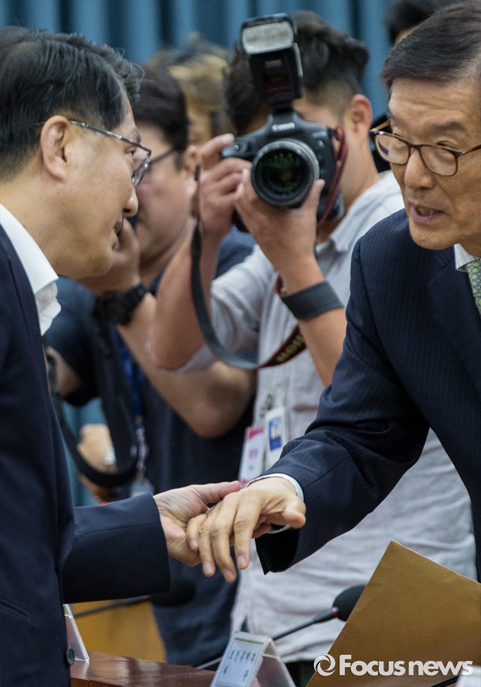 (서울=포커스뉴스) 8일 오전 서울 종로구 정부서울청사에서 열린 구조조정 관계장관회의에 참석한 진웅섭 금융감독원장(왼쪽)과 이동걸 산업은행장이 인사하고 있다.