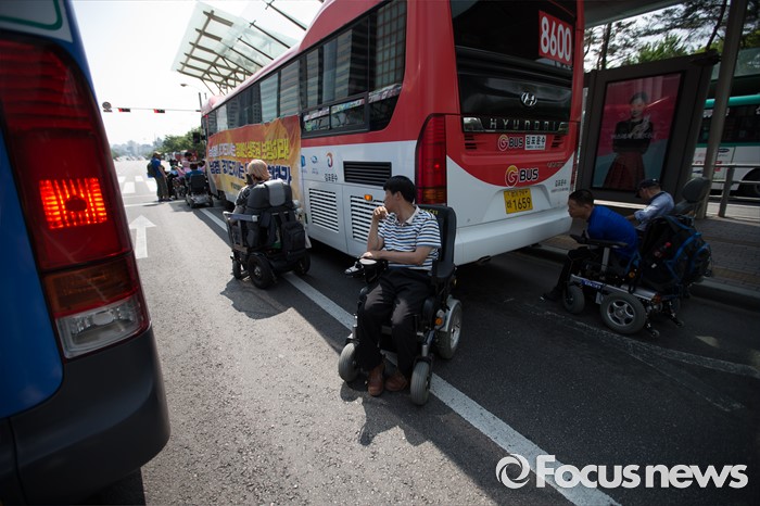 (서울=포커스뉴스) 8일 오후 서울 영등포구 여의도 환승센터 앞에서 경기장애인차별철폐공동투쟁단원들이 장애인 이동권 보장을 촉구하며 경기도행 버스를 막아서고 구호를 외치고 있다.