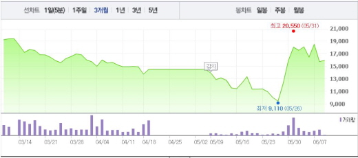 또 이미 결의한 채권단 자율협약에 따라 출자전환 등을 통해 7~8월 재무구조 개선 및 지분구조 개편에 나설 예정이다. 여기에는 5309%(3월말 기준)에 이르는 현대상선의 부채비율을 올해 말까지 226%로 낮추는 방안도 포함됐다.주가흐름<사진출처=네이버 캡쳐>