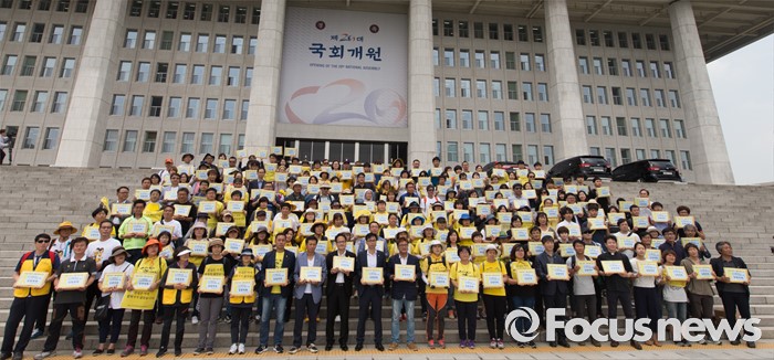 (서울=포커스뉴스) 8일 오전 서울 여의도 국회 앞에서 4.16가족협의회와 4.16연대 관계자들이 세월호 진상규명 특별법 개정 입법청원 기자회견 후 국회 본청 앞에서 입법청원서를 들고 구호를 외치고 있다.