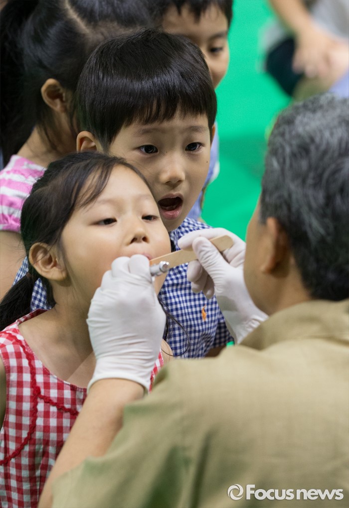 (대전=포커스뉴스) 9일 오전 구강보건의 날을 맞아 대전치과의사회 소속 치과의사들이 대전 서구 대전과학기술대학교에서 어린이집과 유치원 아동 5000여 명을 대상으로 무료 구강검진을 하고 있다.