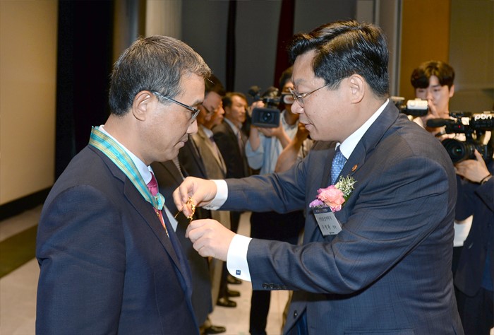 (서울=포커스뉴스) 주형환 산업통상자원부 장관이 9일 서울 포스코센터 서관 아트홀에서 열린 제17회 철의 날 기념식에 참석해 유공자에게 훈·포장을 수여하고 있다.