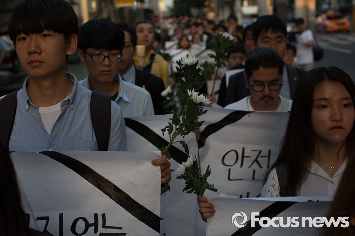 (서울=포커스뉴스) 지난달 28일 서울 지하철 2호선 구의역에서 스크린도어 정비 도중 숨진 김 모씨의 발인을 하루 앞둔 8일 오후 서울 광진구 지하철 2호선 구의역 인근에서 시민들이 김 모씨를 추모하며 행진하고 있다.