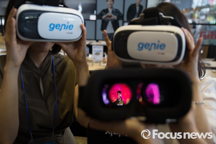 (서울=포커스뉴스) 9일 오전 서울 종로구KT스퀘어에서 열린 KT뮤직 VR서비스 론칭 기자간담회에 참여한 직원들이 관련 서비스를 시연하고 있다.
