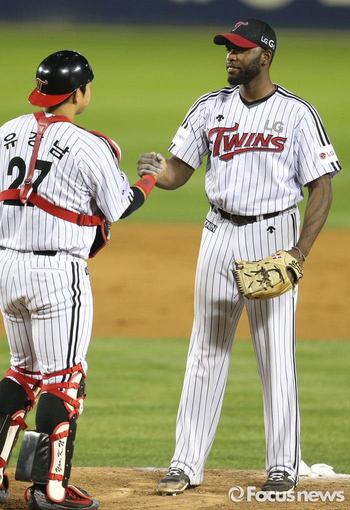 (서울=포커스뉴스) 9일 서울 잠실구장에서 열린 2016 프로야구 삼성-LG 경기에서 LG 투수 헨리 소사가 8회 1사후 안타를 맞고 투수교체를 기다리며 포수 유강남과 손을 맞잡고 있다.