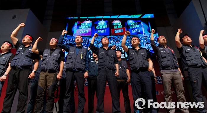이어 "사측의 계속되는 교섭 거부 탓에 중노위가 조정 종료 결정을 내릴 가능성이 높다"며 "조정 종료 결정이 내려지면 조합원 찬반투표를 거쳐 총파업 등 합법적 쟁의행위에 돌입할 수 있게 된다"고 말했다.(서울=포커스뉴스) 14일 오후 서울 강서구 KBS스포츠월드에서 성과연봉제 저지를 위한 금융공기업지부 합동 대의원대회에 참석한 금융노조 조합원들이 구호를 외치고 있다. 2016.05.14 김인철 기자
