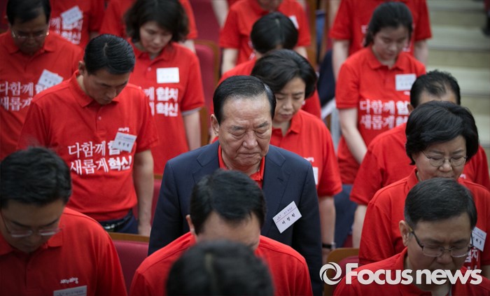 (과천=포커스뉴스) 10일 오전 경기도 과천 국가공무원인재개발원에서 열린 2016 새누리당 정책워크숍에 참석한 서청원 전 최고위원이 묵념을 하고 있다.