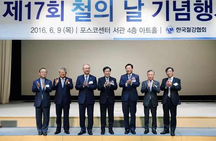 (서울=포커스뉴스) 주형환 산업통상자원부 장관이 9일 서울 포스코센터 서관 아트홀에서 열린 제17회 철의 날 기념식에 참석해 기념촬영하고 있다.