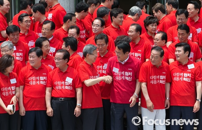 (과천=포커스뉴스) 10일 오전 경기도 과천 국가공무원인재개발원에서 열린 2016 새누리당 정책워크숍에 참석한 김희옥 혁신비대위원장, 정진석 원내대표이 기념촬영을 마친 뒤 악수하고 있다.