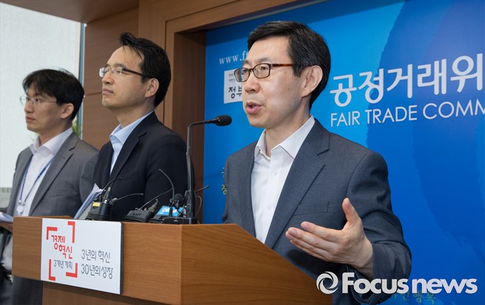 (세종=포커스뉴스) 신영선 공정거래위원회 사무처장이 8일 오전 세종시 정부세종청사 공정위 기자실에서 대기업집단 지정제도 개선방안에 대한 브리핑을 하고 있다. 오른쪽부터 신영선 사무총장, 박춘호 기획재정부 법인세제과장. 이병원 기획재정부 기업환경과장.