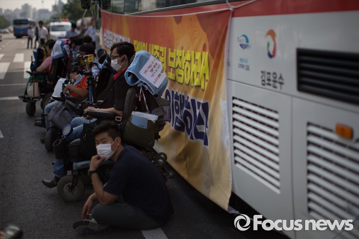 (서울=포커스뉴스) 8일 오후 서울 영등포구 여의도 환승센터 앞에서 경기장애인차별철폐공동투쟁단원들이 장애인 이동권 보장을 촉구하며 경기도행 버스를 막아서고 구호를 외치고 있다.