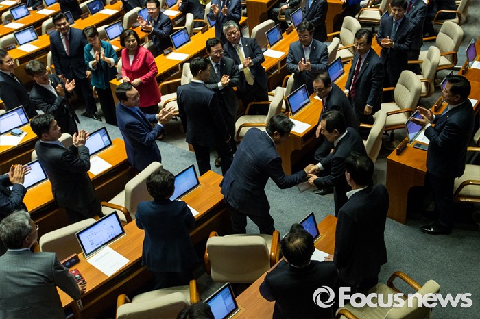 (서울=포커스뉴스) 9일 오후 서울 여의도 국회에서 열린 본회의에서 20대 국회 전반기 국회의장으로 선출된 정세균 더불어민주당 의원이 수락 연설을 하기 위해 연단으로 이동하며 동료의원들에게 축하 받고 있다.