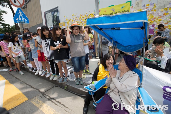 | △ 학생들에게 박수를 보내는 길원옥 할머니 |
