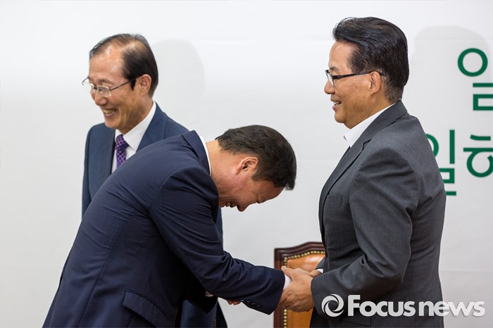 (서울=포커스뉴스) 김재원(왼쪽) 청와대 정무수석이 10일 오후 서울 여의도 국회에서 박지원 국민의당 원내대표와 예방을 마친 뒤 악수 하고 있다.