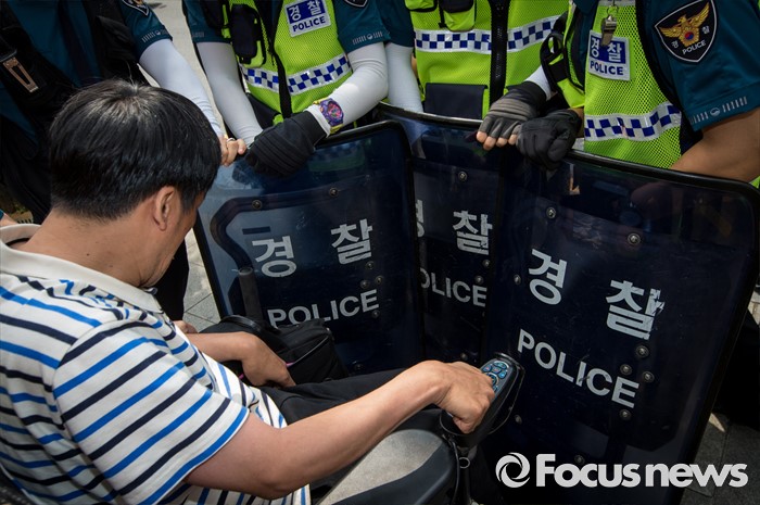 (서울=포커스뉴스) 9일 오전 서울시청 서소문별관 인근의 버스정류장에서 장애인차별철폐연대 회원들이 장애인 이동권 보장을 촉구하며 경기도행 광역버스 기습 점거시위를 벌여 경찰과 충돌하고 있다.