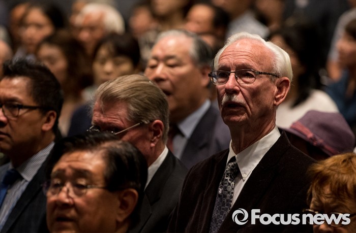 (서울=포커스뉴스) 10일 오전 서울 중구 프레스센터에서 열린 6.10 민주항쟁 제29주년 기념식에 참석한 해외민주인사가 애국가를 부르고 있다.