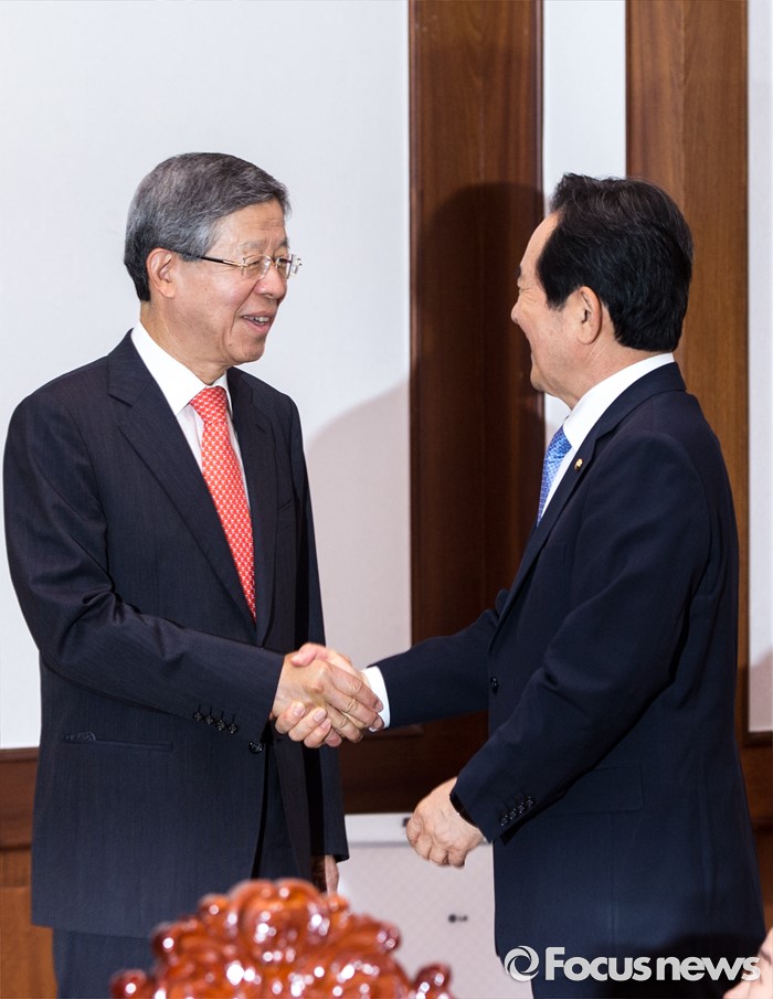 (서울=포커스뉴스) 정세균(오른쪽) 국회의장이 10일 오후 서울 여의도 국회에서 김희옥 새누리당 혁신비상대책위원회 위원장과 면담에 앞서 악수 하고 있다.