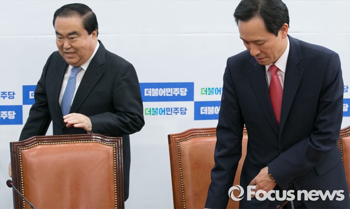 (서울=포커스뉴스) 우상호(오른쪽) 더불어민주당 원내대표가 8일 오후 서울 여의도 국회에서 새누리당의 국회의장직을 야당이 맡고 운영 및 법사위를 여당이 맡자는 제안과 관련 논의를 위한 4선 이상 중진 의원과의 간담회에 참석해 문희상 의원을 안내하고 있다.