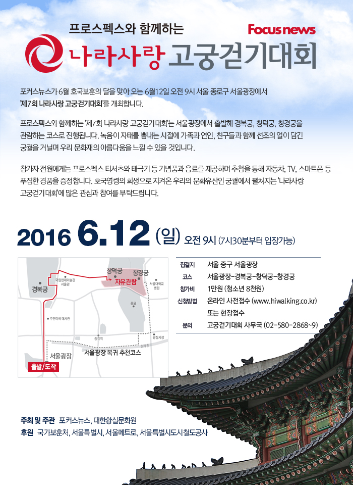(서울=포커스뉴스) <포커스뉴스> 주최로 오는 12일 서울 중구와 종로구에 위치한 고궁 일대에서 열리는 '제7회 나라사랑 고궁걷기대회' 온라인 참가 신청이 9일 마감된다.