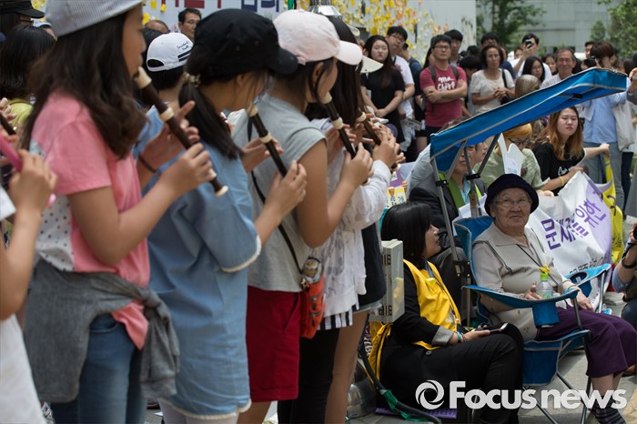 (서울=포커스뉴스) 8일 오후 서울 종로구 옛 일본대사관 앞에서 열린 제 1234차 일본군 위안부 문제해결을 위한 정기 수요시위에 참석한 초등학교 학생들이 길원옥 할머니 앞에서 리코더 공연을 선보이고 있다.