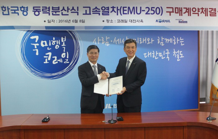 EMU-250의 기술 기반이 된 차세대 고속열차 HEMU-430은 국토교통부에서 2007년 7월부터 개발을 시작, 2013년 3월28일 운행선로에서 세계 4번째로 421.4Km/h 달성에 성공하고 12만km에 달하는 주행시험을 했다.최용균 현대로템 철도영업본부장(좌)과 정인수 코레일 기술본부장이 한국형 동력분산식 고속열차 구입 계약을 체결한 후 기념촬영하고 있다.<사진제공=코레일>