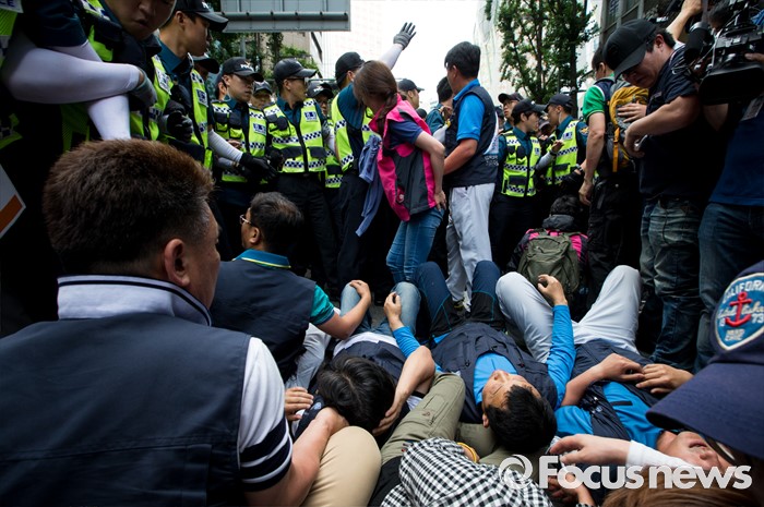 (서울=포커스뉴스) 8일 오후 서울 을지로 옛 국가인권위원회 옥상 광고탑에서 기아자동차 비정규직 노동자의 정규직화를 요구하며 363일 동안 고공농성을 벌인 한규협씨와 최정명씨가 경찰에 의해 구급차로 끌려가자 노조원들이 차량을 막아서고 있다.