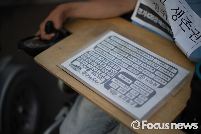 (서울=포커스뉴스) 8일 오후 서울 영등포구 여의도 환승센터 앞에서 경기장애인차별철폐공동투쟁단원들이 장애인 이동권 보장을 촉구하며 경기도행 버스를 막아서고 구호를 외치고 있다.