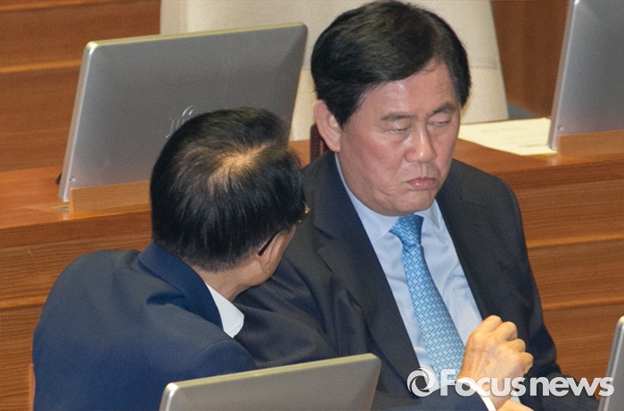 (서울=포커스뉴스) 9일 오후 서울 여의도 국회에서 열린 20대 국회 첫 본회의에 참석한 최경환(오른쪽), 김종태 새누리당 의원이 대화하고 있다.