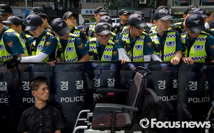 (서울=포커스뉴스) 9일 오전 서울시청 서소문별관 인근의 버스정류장에서 장애인차별철폐연대 회원들이 장애인 이동권 보장을 촉구하며 경기도행 광역버스 기습 점거시위를 벌여 경찰과 충돌하고 있다.