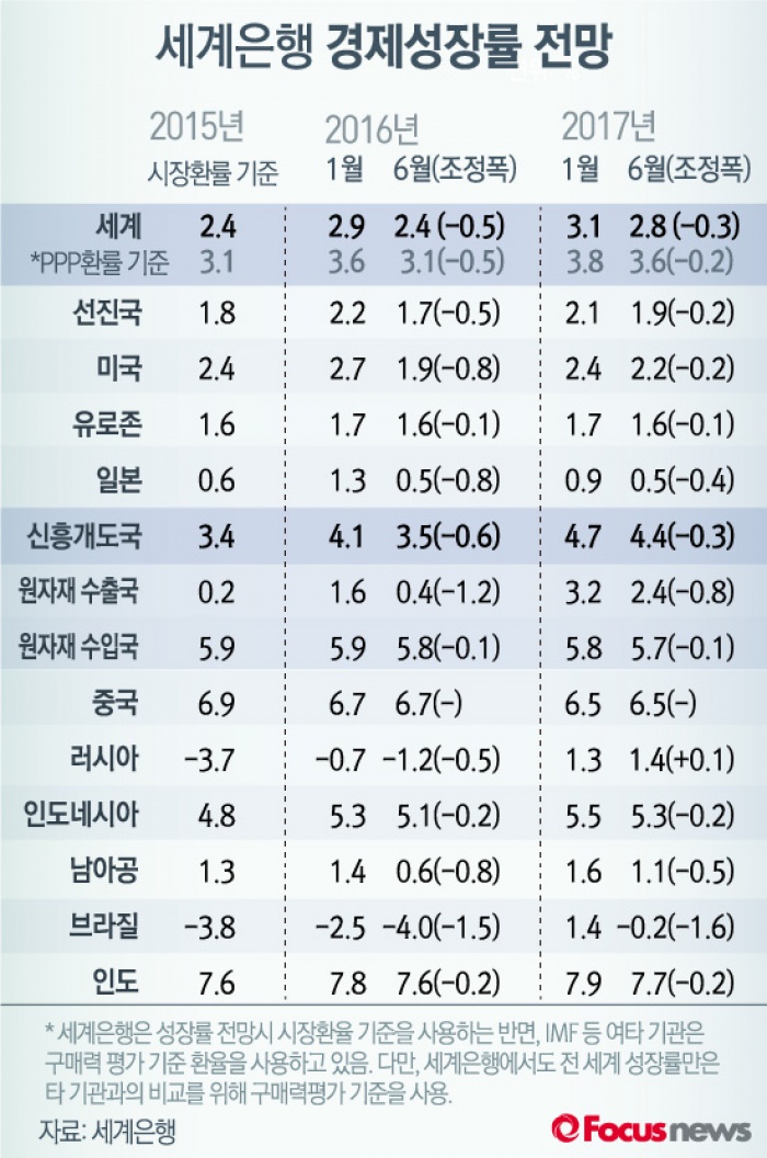 (서울=포커스뉴스) 7일(현지시각) 세계은행이 발표한 ‘6월 세계경제전망’에 따르면 올해와 내년 세계 경제성장률이 지난 1월 발표치보다 모두 하향조정됐다.