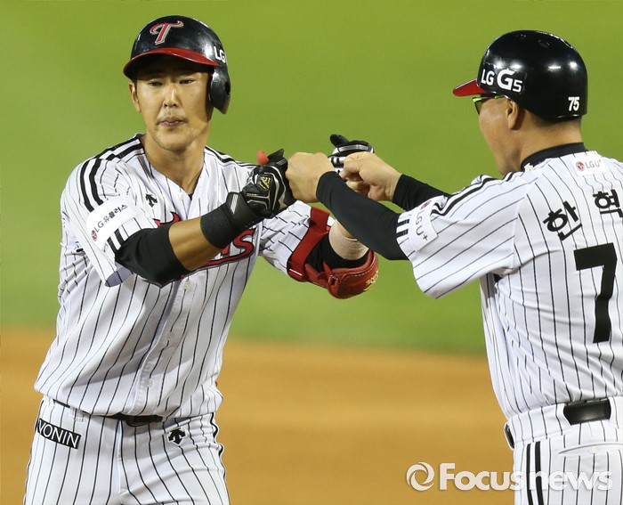 (서울=포커스뉴스) 9일 서울 잠실구장에서 열린 2016 프로야구 삼성-LG 경기 5회말 1사 1,2루에서 LG 정주현이 2타점 중전 안타를 치고 한혁수 코치의 축하를 받고 있다.