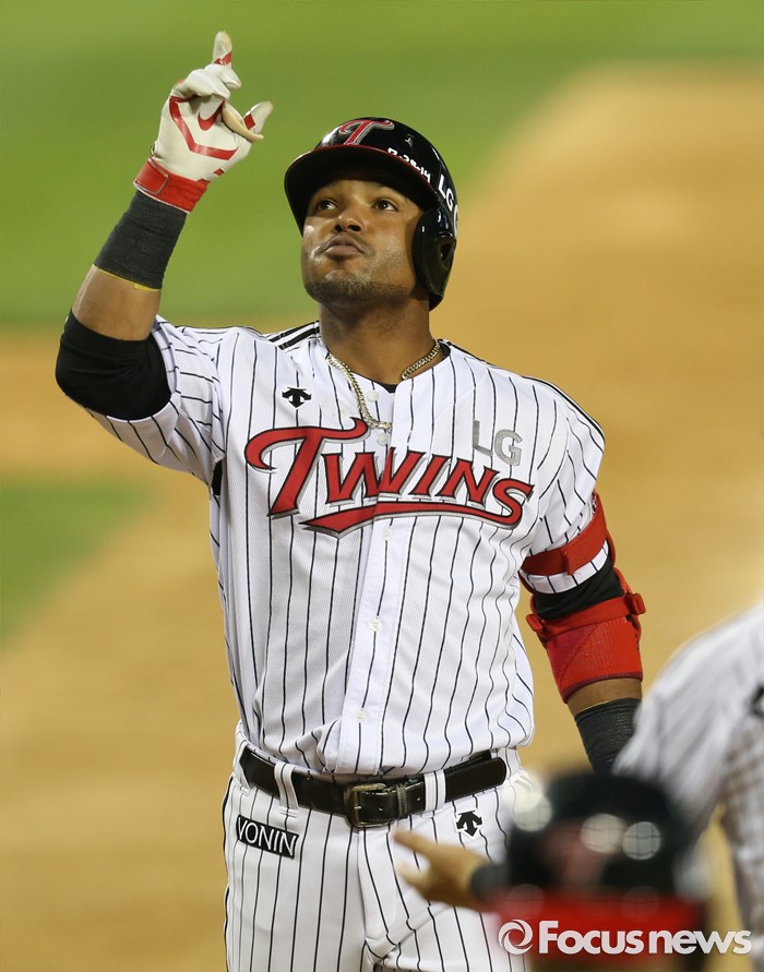 (서울=포커스뉴스) 9일 서울 잠실구장에서 열린 2016 프로야구 삼성-LG 경기 5회말 2사 1루에서 LG 히메네스가 좌월 2점 홈런을 치고 홈인하며 세레머니를 하고 있다.