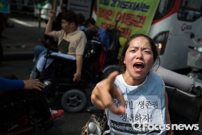 (서울=포커스뉴스) 8일 오후 서울 영등포구 여의도 환승센터 앞에서 경기장애인차별철폐공동투쟁단원들이 장애인 이동권 보장을 촉구하며 경기도행 버스를 막아서고 구호를 외치고 있다.