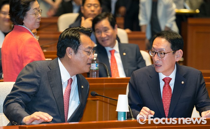 (서울=포커스뉴스) 9일 오전 서울 여의도 국회에서 국회 부의장 후보 선출을 위해 열린 새누리당 의원총회에 참석한 정진석(왼쪽) 원내대표와 김도읍 원내수석부대표가 대화하고 있다.