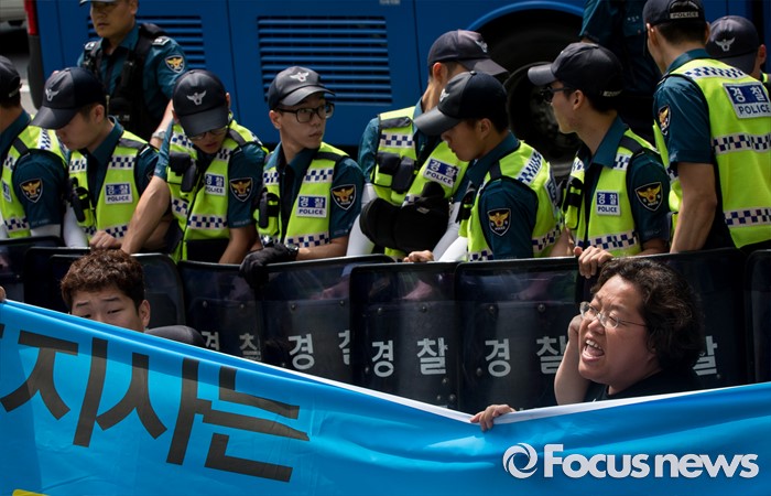 (서울=포커스뉴스) 9일 오전 서울시청 서소문별관 인근의 버스정류장에서 장애인차별철폐연대 회원들이 장애인 이동권 보장을 촉구하며 경기도행 광역버스 기습 점거시위를 벌여 경찰과 충돌하고 있다.