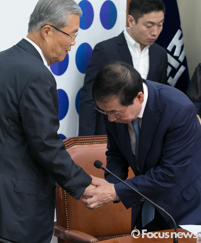 (서울=포커스뉴스) 8일 오전 서울 여의도 국회에서 구의역 스크린도어 노동자 사망 사건과 관련해 열린 더불어민주당-서울시 정책간담회에 참석한 김종인(왼쪽) 비대위 대표가 먼저 퇴장하며 박원순 서울시장과 악수하고 있다.