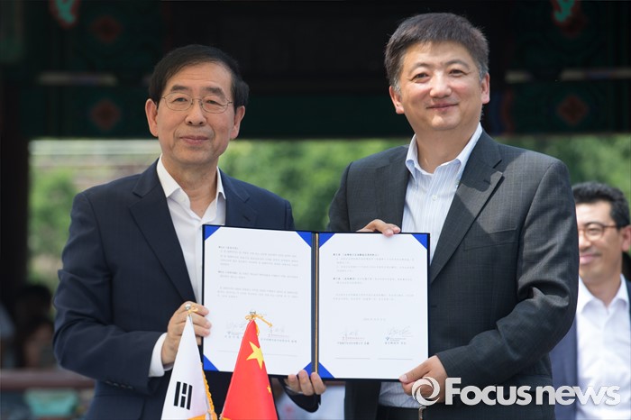 (서울=포커스뉴스) 박원순(왼쪽) 서울시장과 쉐샤오깡 중국여행사총사유한공사(CTS) 총재가 9일 오후 서울 중구 남산 한옥마을에서 한-중 관광산업 상생발전을 위한 업무협약 체결 후 기념촬영 하고 있다.