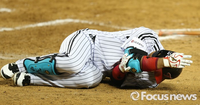 (서울=포커스뉴스) 8일 서울 잠실구장에서 열린 2016 프로야구 삼성-LG 경기 4회말 무사 1,2루에서 LG 이병규가 히메네스에 이어 삼성 장필준의 투구에 오른쪽 팔꿈치를 맞고 그라운드에 쓰러져 있다.