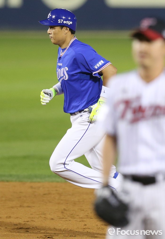 (서울=포커스뉴스) 7일 서울 잠실구장에서 열린 2016 프로야구 삼성-LG 경기 8회초 2사 1,2루에서 삼성 이승엽이 우월 3점 홈런을 치고 베이스를 돌고 있다.