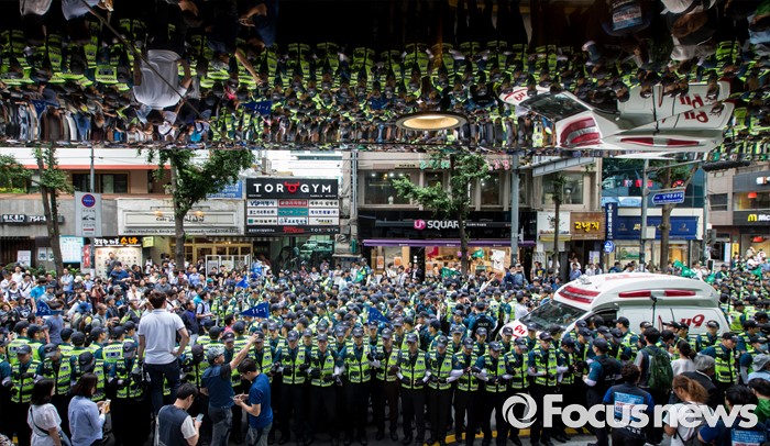 (서울=포커스뉴스) 8일 오후 서울 을지로 옛 국가인권위원회 옥상 광고탑에서 기아자동차 비정규직 노동자의 정규직화를 요구하며 363일 동안 고공농성을 벌인 한규협씨와 최정명씨가 경찰에 의해 구급차로 끌려가자 노조원들이 차량을 막아서고 있다.