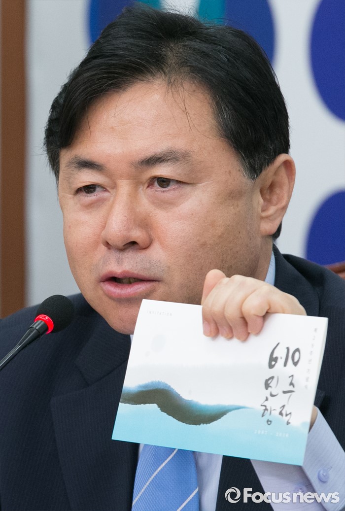(서울=포커스뉴스) 8일 오전 서울 여의도 국회에서 열린 더불어민주당 비상대책위원회의에 참석한 김영춘 비대위원이 6·10 민주항쟁 기념식 초대장을 들고 발언하고 있다.