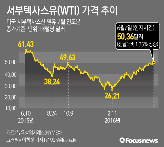 7일(현지시간) 뉴욕상업거래소(NYMEX)에서 서부텍사스산원유(WTI) 가격은 전날보다 배럴당 0.67달러(1%) 상승한 50.36달러를 기록했다.