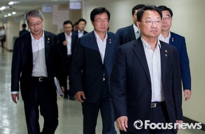 (서울=포커스뉴스) 8일 오전 서울 종로구 정부서울청사에서 유일호 부총리 겸 기획재정부 장관, 이기권 고용노동부 장관, 임종룡 금융위원장, 주형환 산업통상자원부 장관, 김영석 해양수산부 장관이 구조조정 추진현황 및 계획에 대해 발표하기 위해 발걸음을 옮기고 있다.