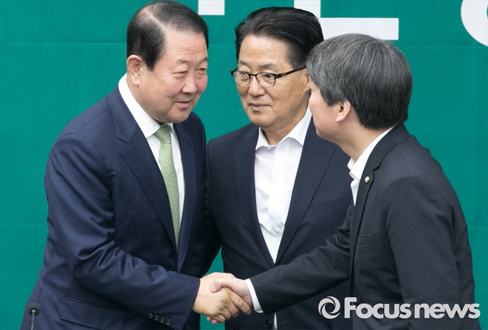 (서울=포커스뉴스) 9일 오전 서울 여의도 국회에서 국회 부의장 후보 선출을 위해 열린 국민의당 의원총회에 참석한 지도부가 박주선 의원을 축하해주고 있다. 왼쪽부터 박 의원, 박지원 원내대표, 안철수 상임공동대표. 이날 국민의당은 국회 부의장 후보로 박주선 의원을 선출했다.