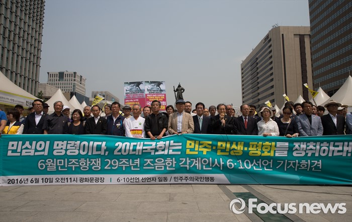 (서울=포커스뉴스) 10일 오전 서울 종로구 광화문 광장에서 민주주의국민행동 단체 회원들이 6.10 민주항생 29주년 관련 기자회견을 하고 있다.