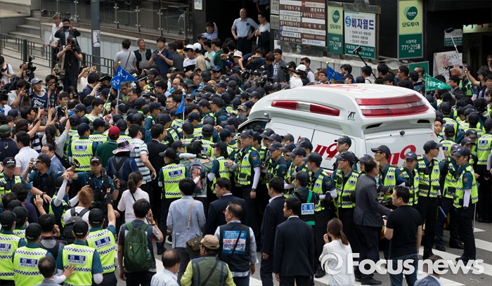 (서울=포커스뉴스) 사내하청 전원 정규직화를 요구하며 고공농성을 벌여온 기아자동차 사내하청 노동자 최정명씨와 한규협씨가 농성을 해제한 8일 오후 서울 중구 옛 국가인권위원회 건물 옥상 광고탑 농성장에서 내려와 병원으로 이동하던 중 경찰과 노조원들이 실랑이를 벌이고 있다.