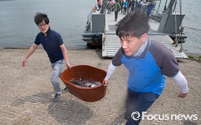 (서울=포커스뉴스) 10일 오후 서울 성동구 뚝도나루에서 성동구청 관계자들이 서해 5도 활어들을 옮기고 있다. 6월부터 8월까지 2, 4주 금요일에 뚝도시장에 수산물 장서는 날을 운영하며 9월부터는 7일장 형태로 상설운영 할 예정이다.
