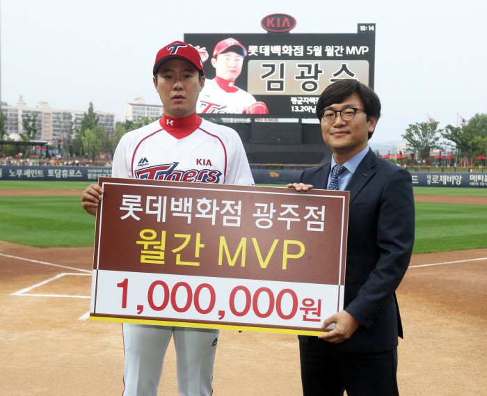 김광수는 5월 한달간 11경기 등판해 6세이브 평균자책점 0.66으로 뒷문을 지켜냈다. 13과 3분의 2이닝 11탈삼진으로 좋은 구위를 선보였다. MVP 상금은 100만원이다.프로야구 KIA 투수 김광수(왼쪽)가 10일 광주구장에서 열린 삼성과의 경기에 앞서 롯데백화점 광주점 5월 월간 MVP 시상식을 갖고 있다. 시상자는 롯데백화점 광주점 김정현 점장. <사진제공=KIA 타이거즈>