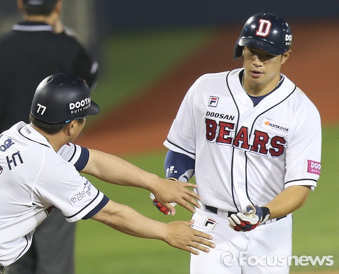 (서울=포커스뉴스) 10일 서울 잠실구장에서 열린 2016프로야구 롯데-두산 경기 6회말 무사 1,2루에서 두산 김재환이 우월 3점 홈런을 치고 3루를 돌며 전형도 코치의 환영을 받고 있다.