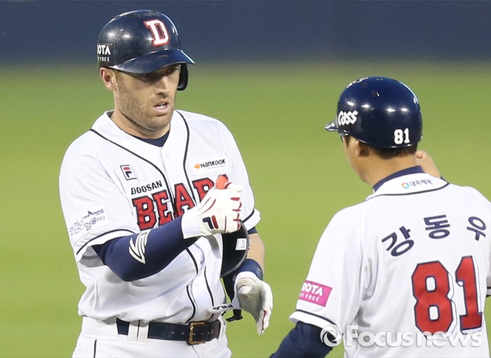 (서울=포커스뉴스) 10일 서울 잠실구장에서 열린 2016프로야구 롯데-두산 경기 4회말 무사 1루에서 두산 에반스가 중견수 오른쪽 2루타를 날리고 강동우 코치의 축하를 받고 있다.